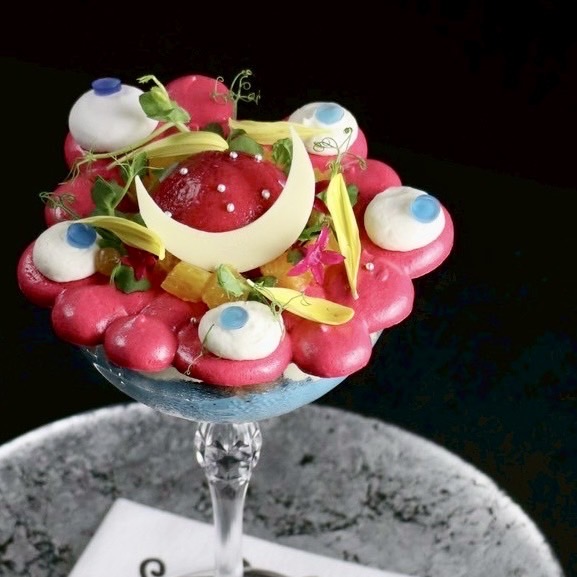 苺の力強い目がチャームポイントのお父さん鯉は中によもぎジェラートと求肥、粒あんのジュレでよもぎ餅のような味わいに。