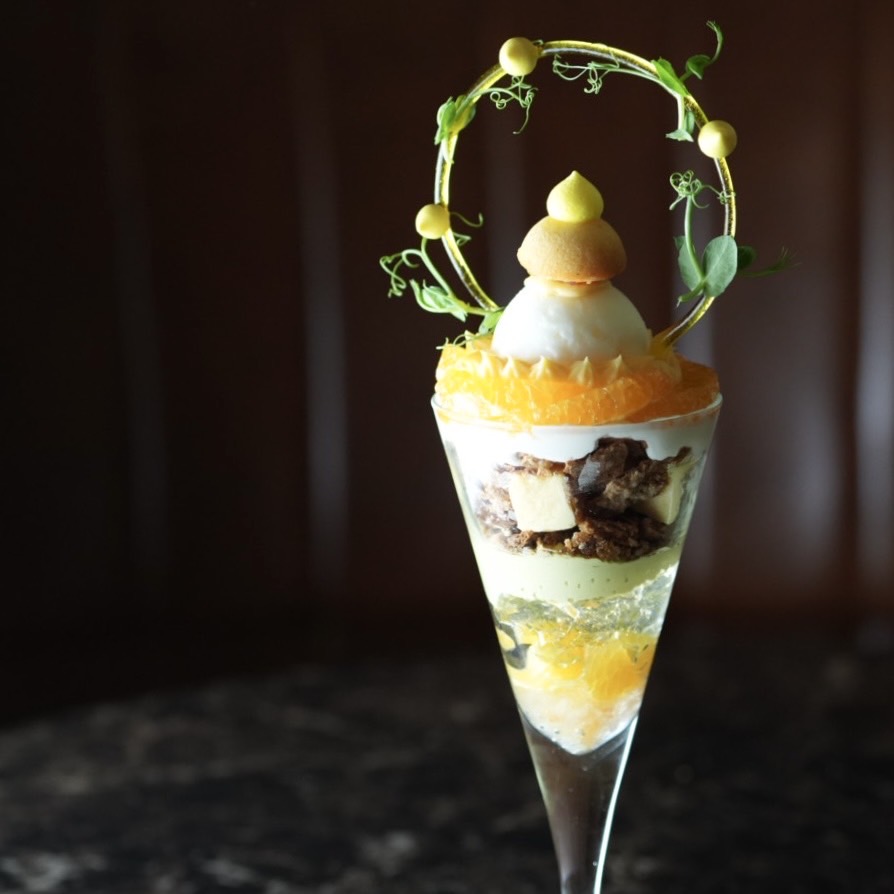 春を身に纏っているかのような桜色のドレスは桜餡のクリームの中に大吟醸を使ったジェラートを忍ばせ甘いだけじゃない大人な雰囲気に