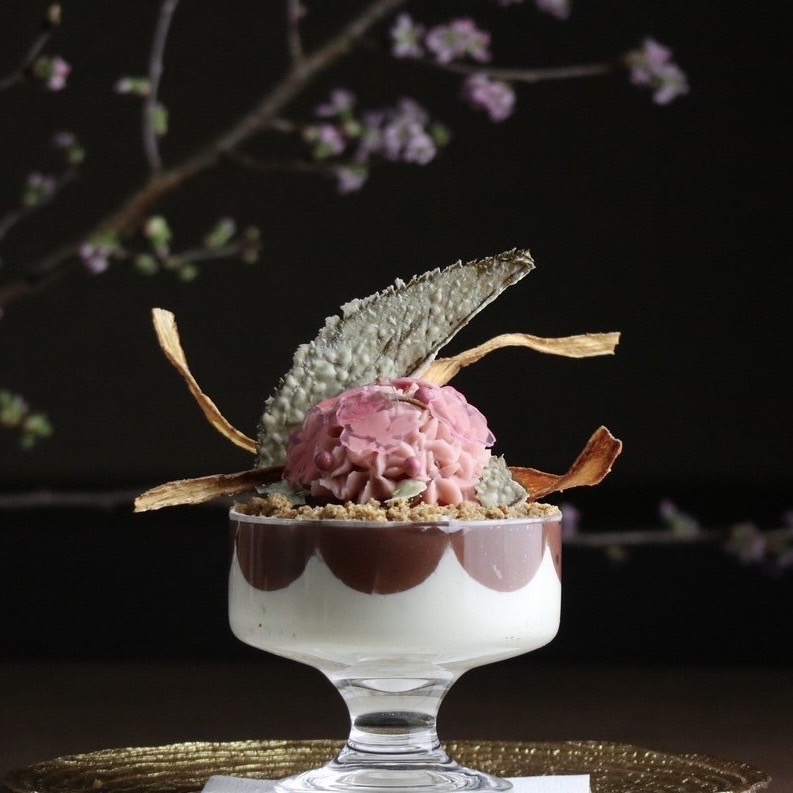 桜のジェラートと求肥で桜餅のような味わいに香ばしいパイの食感を加え抹茶や大吟醸など和の食材と