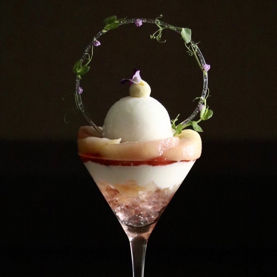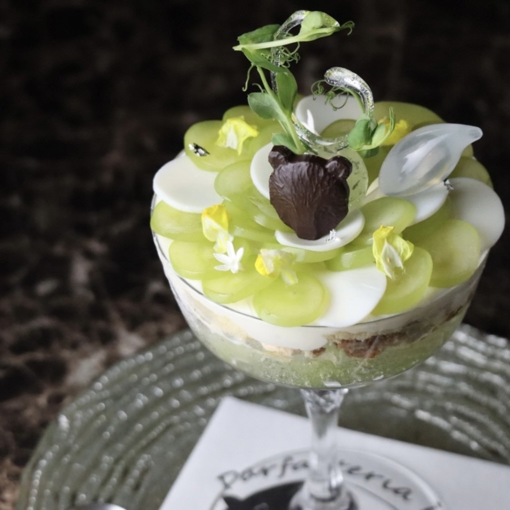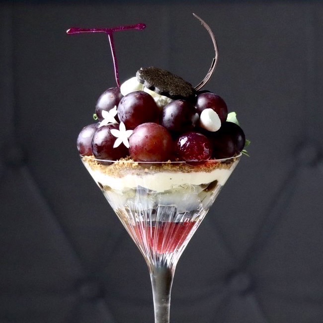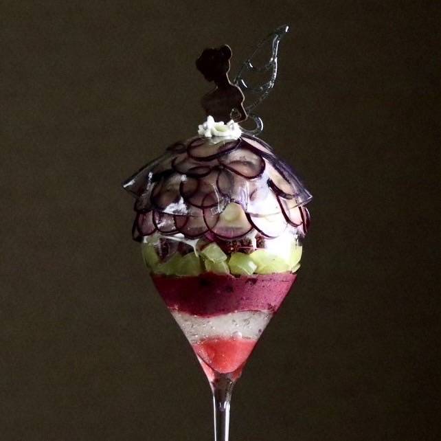 新鮮でみずみずしい葡萄と甘酸っぱいルバーブソルベ、濃厚なクレームダンジュの相性が良いパフェです。