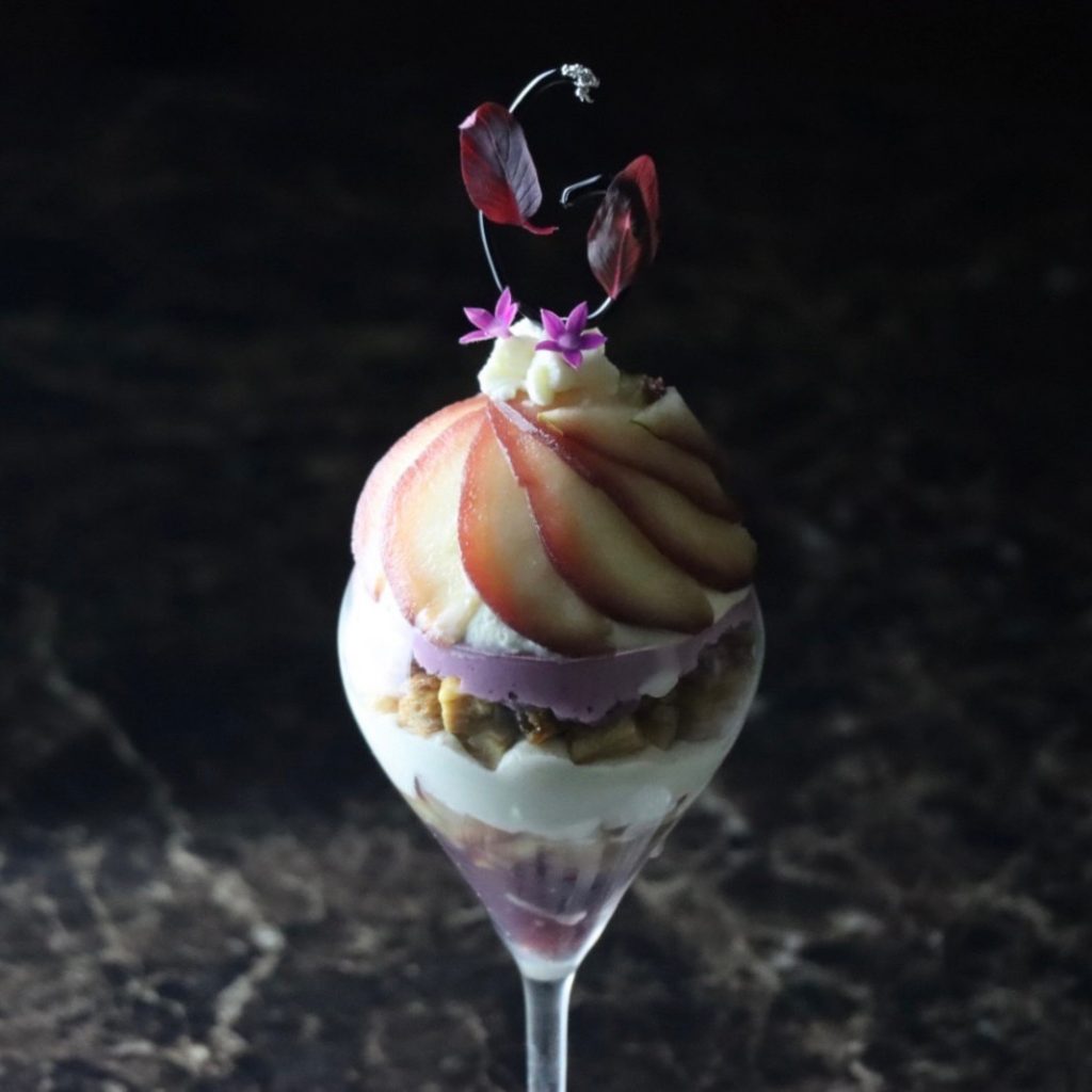 アニス香る和梨のコンポートスライスで、月を霞ませる朧雲を表現しております。