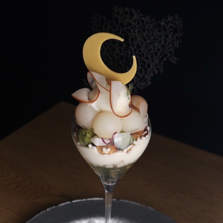 アニス香る和梨のコンポートスライスで、月を霞ませる朧雲を表現しております。