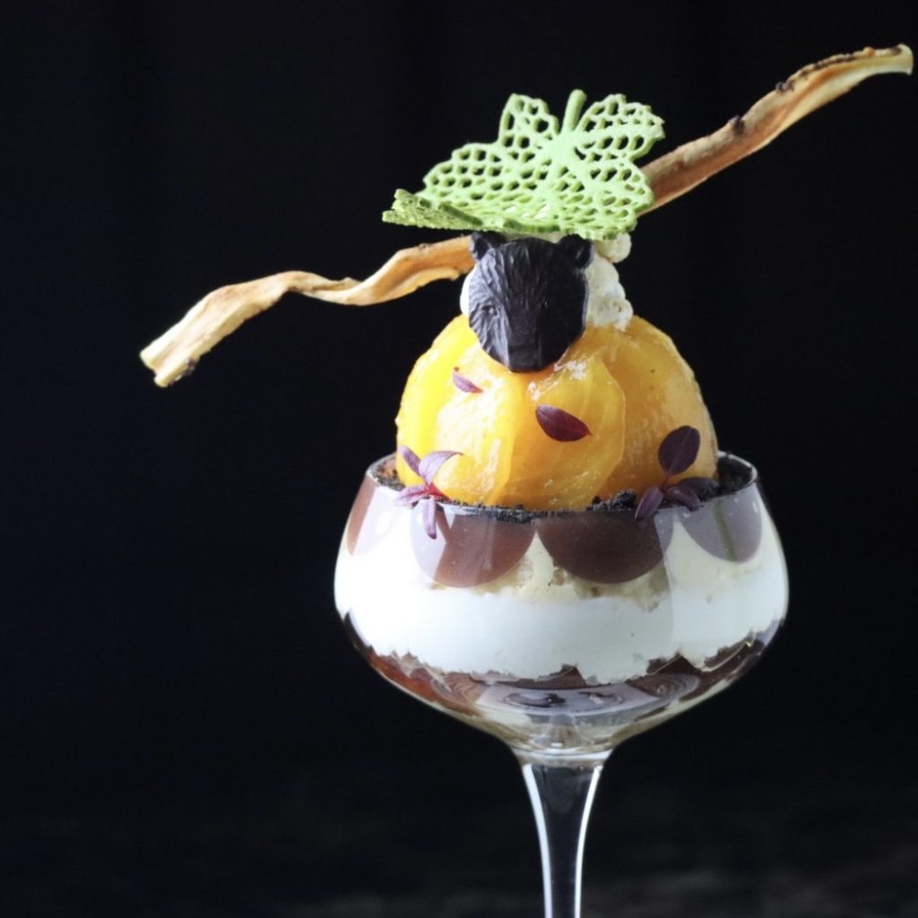 グラスの中は、ほうじ茶のジェラートや栗の黒糖グラッセを散りばめ、加賀棒茶ジュレや燻製したあんこがありくどくなく秋の味覚を深くお楽しみ頂けます。