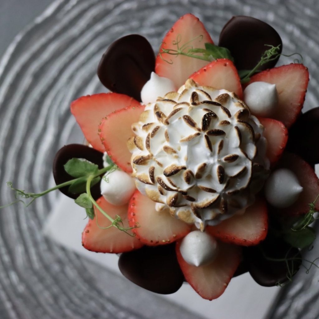 相性のいいさっぱりしたハスカップソルベを合わせ、モンブランクリームの周りには桜チップで燻製したアーモンドフロランタンを散らばめ食感とスモーキーな風味を加えました。
