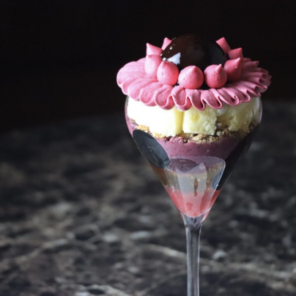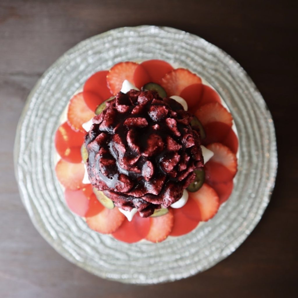 濃厚なピスタチオジェラートの上に桜餡のクリームを絞り、抹茶のティラミスやほうじ茶のブリュレの和の味わいと大吟醸の豊かな香りを是非お召し上がりください。