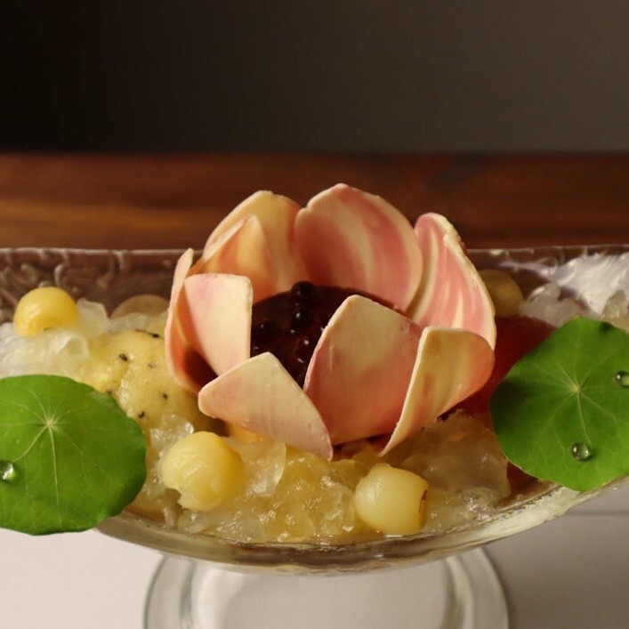 山椒と発酵乳のジェラートと洋梨が、彩り鮮やかに飾られた竹炭ダンテルの元で出会いました。