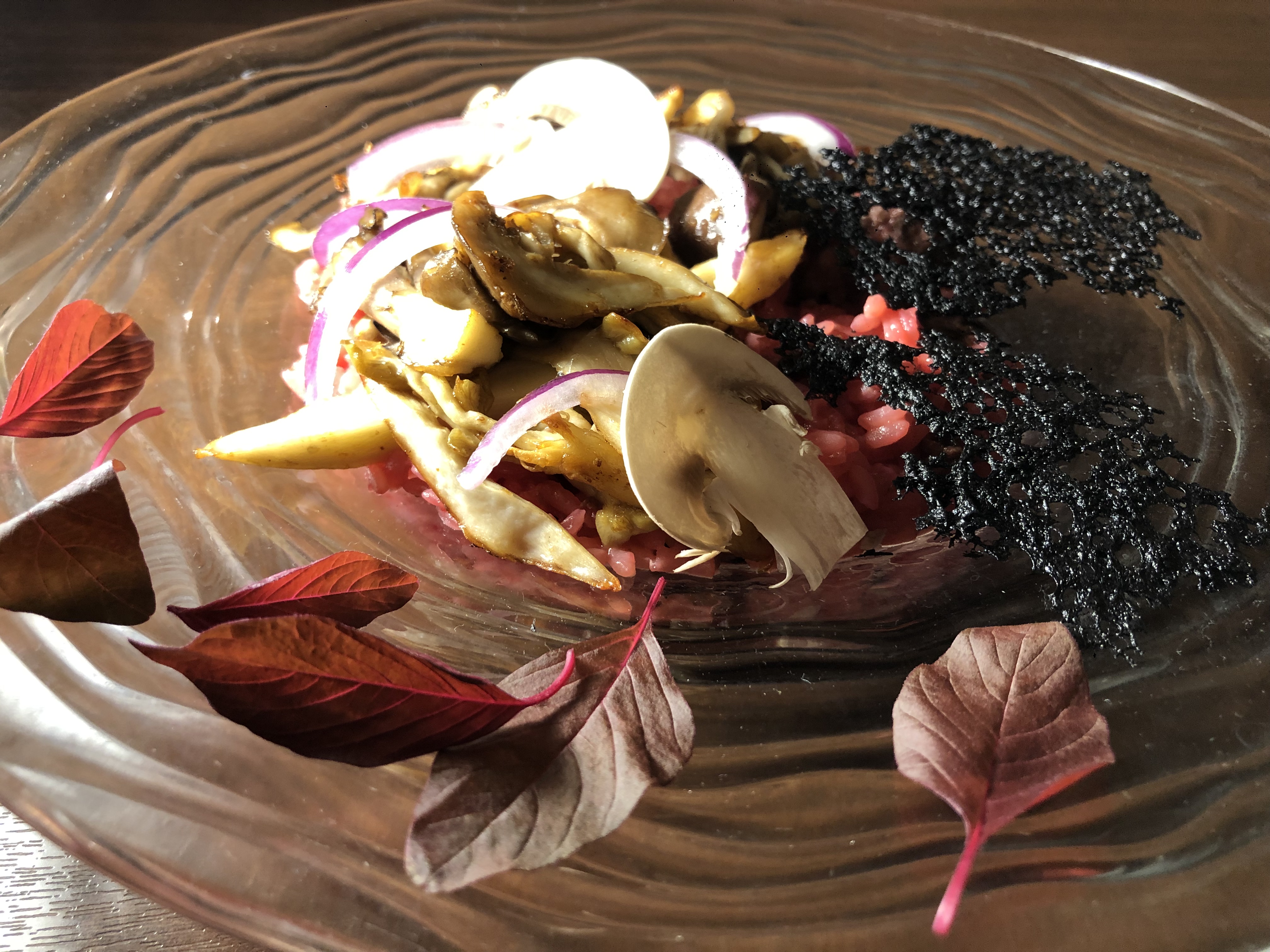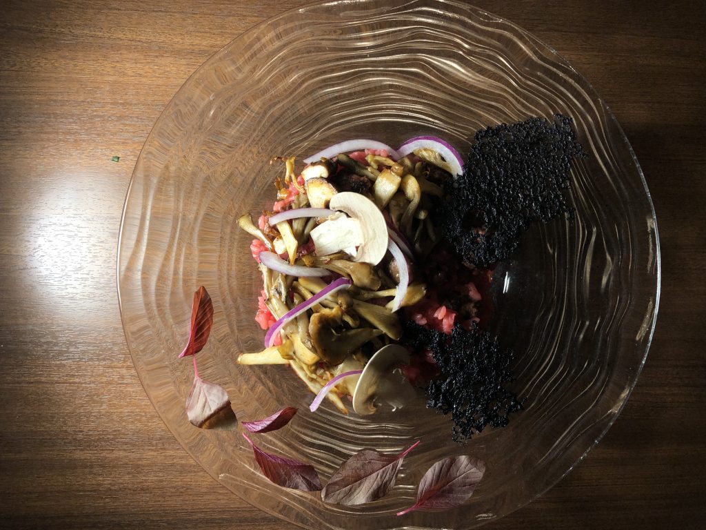 『6種きのこの焦がしバターソテー、蝦夷鹿のひき肉とビーツのリゾット』