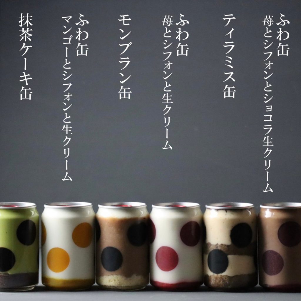 『FUWA CAN』 gently filled with fluffy chiffon cake in a tin with fruit puree dots pasted on it.