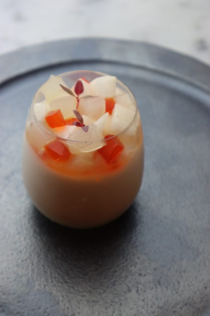 キャラメルムースの中に角切りにした洋梨の果肉とジュレを入れて