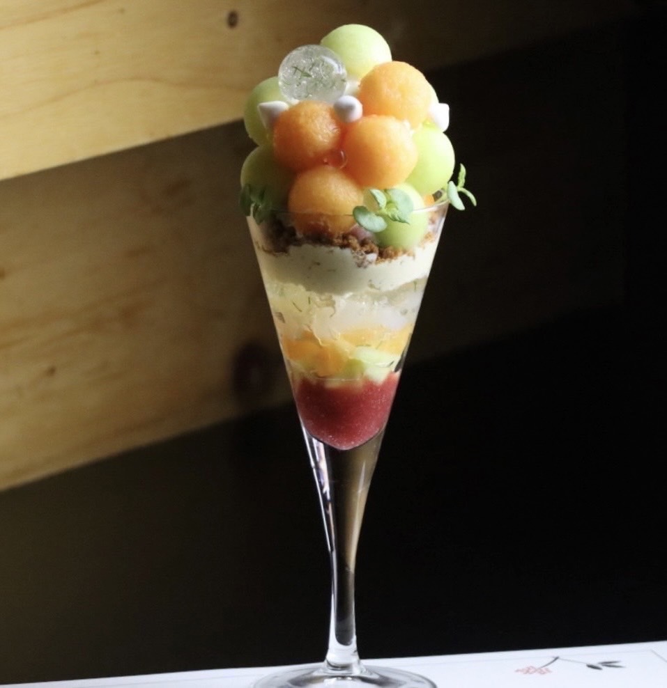球体にくり抜いた鮮やかなメロンの間に