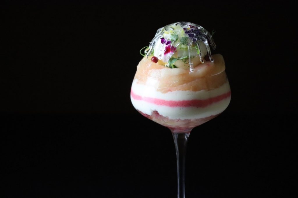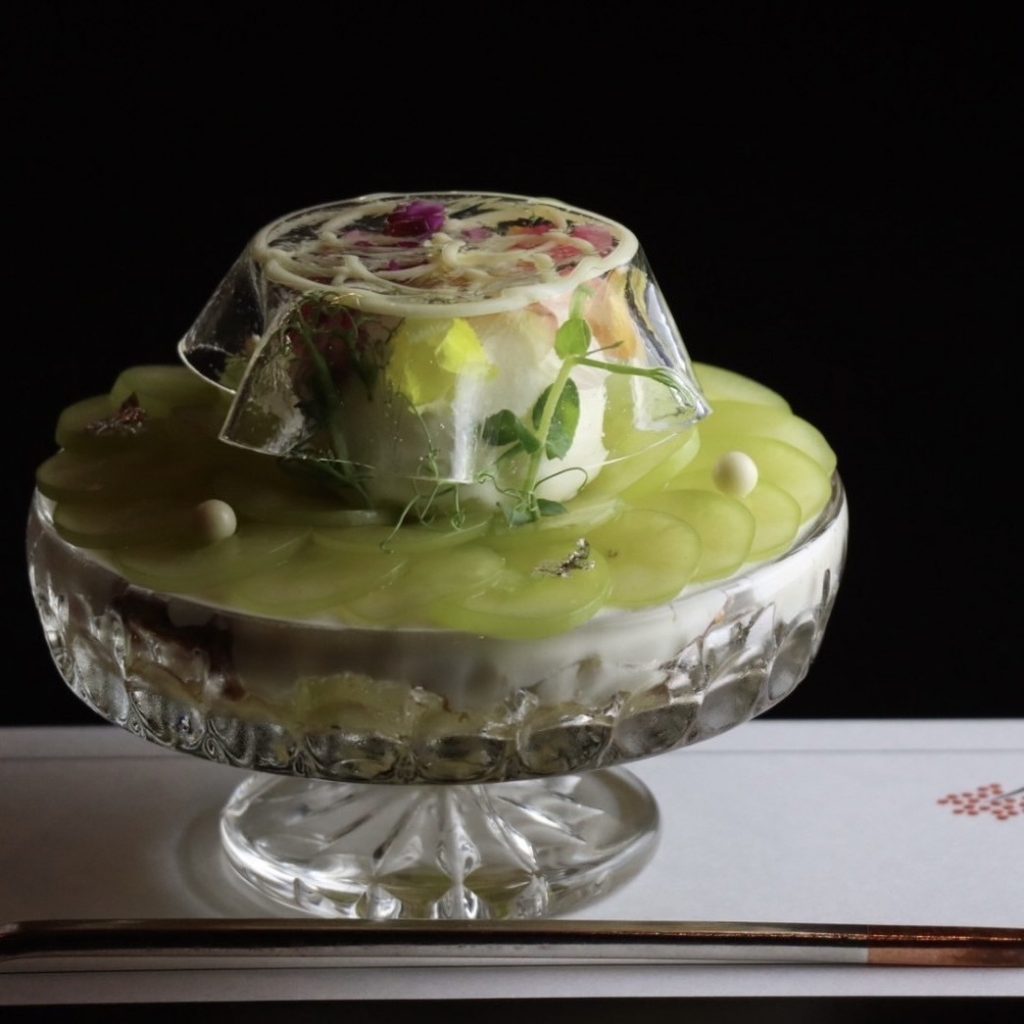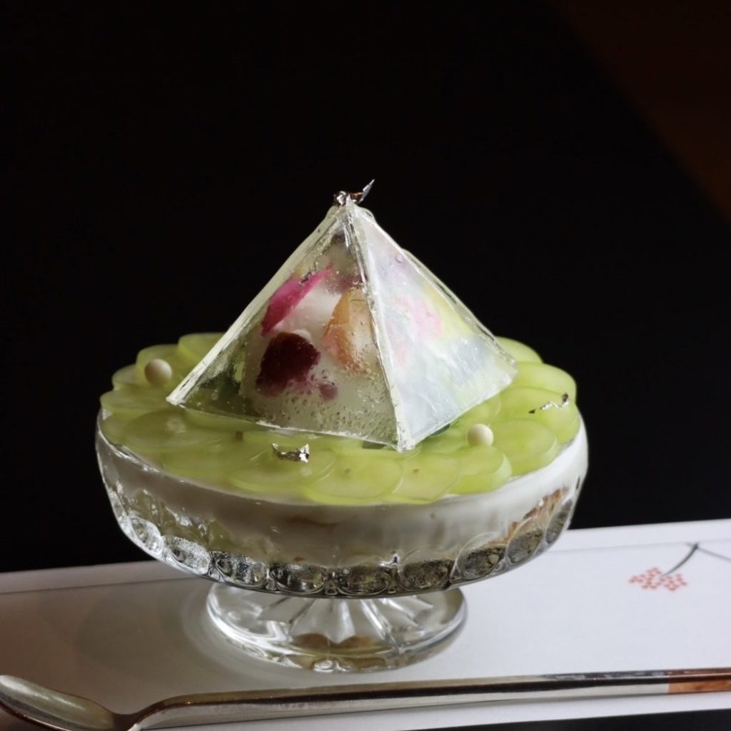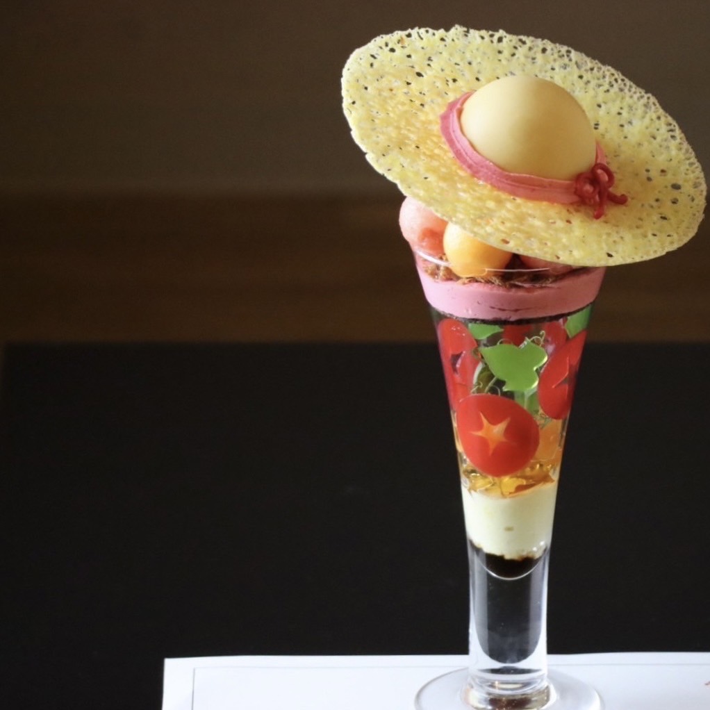 グラスの中には、日本酒を使った男山大吟醸ジェラートやとうきびの甘さが癖になるムースなどがございます。