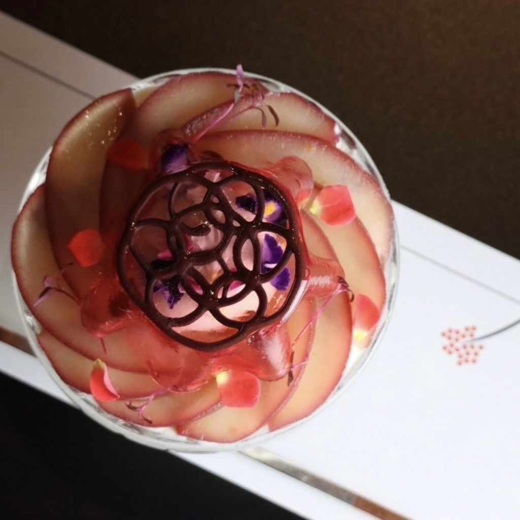 程よい甘みと酸味のプラムソルベの上にピーチウーロンのジュレ、周りにはプラムを並べまるで赤く燃える太陽のように。