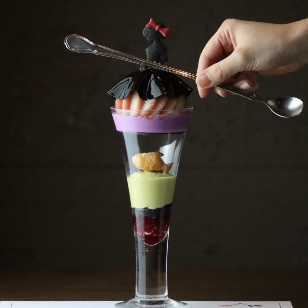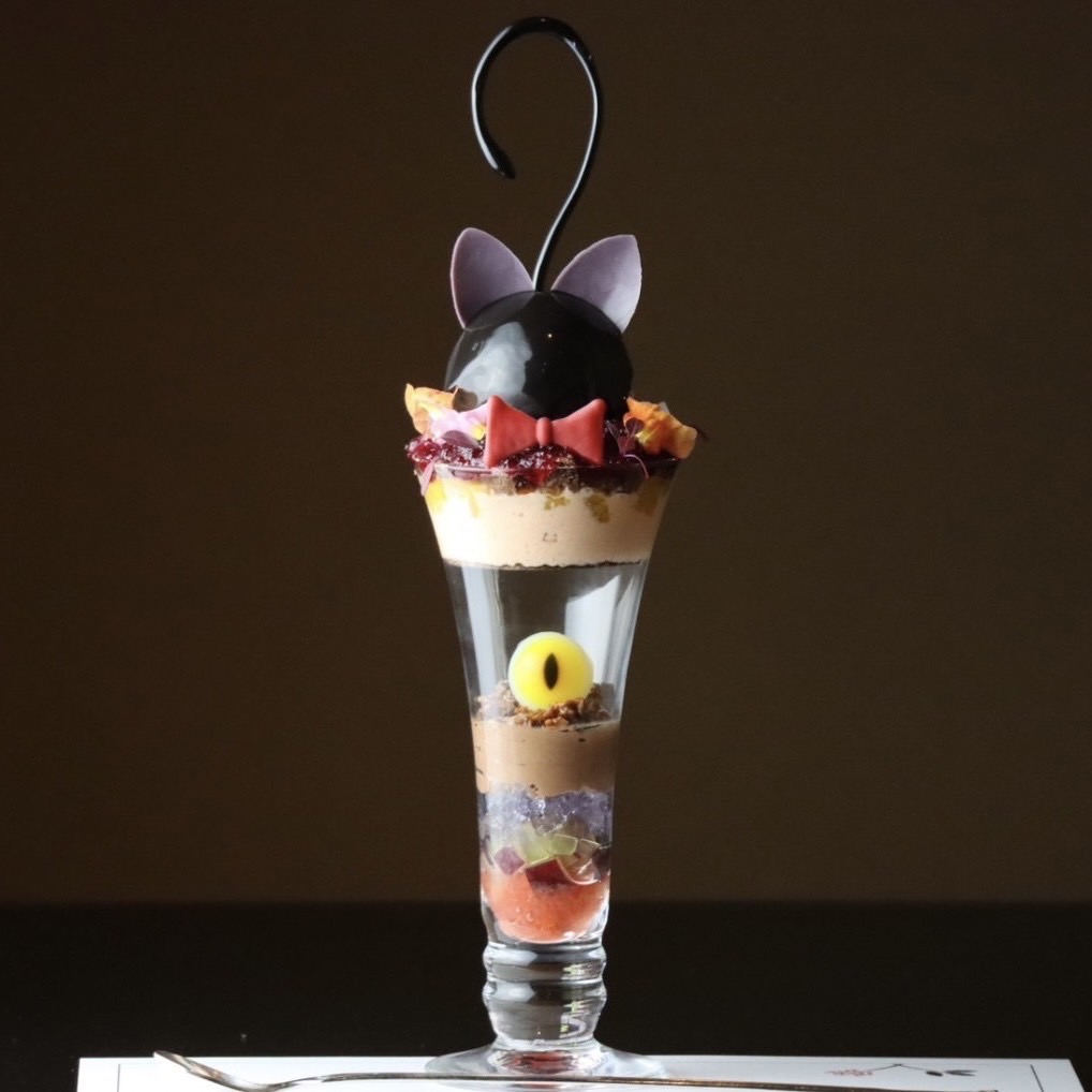 グラスの中は、当店で馴染みのあるクマゲラのクッキーやほろ苦いボネと滑らかなピスタチオプリンがございます。