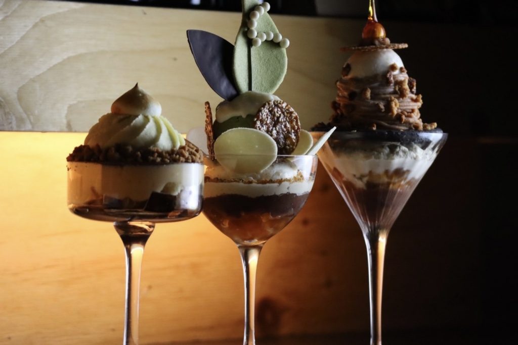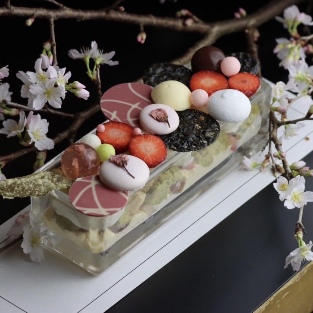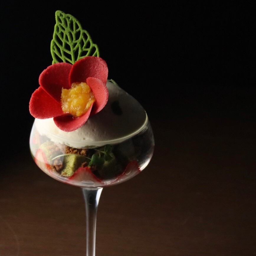 グラスの中には、抹茶と山椒を混ぜた微かにピリッとするジェノワーズやディプロマット、酸味のある苺やフランボワーズソルベがございますで混ぜ合わせてお召し上がりください。