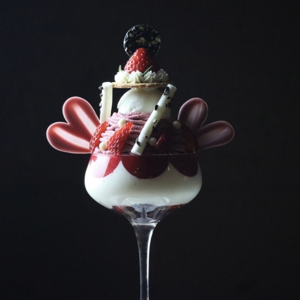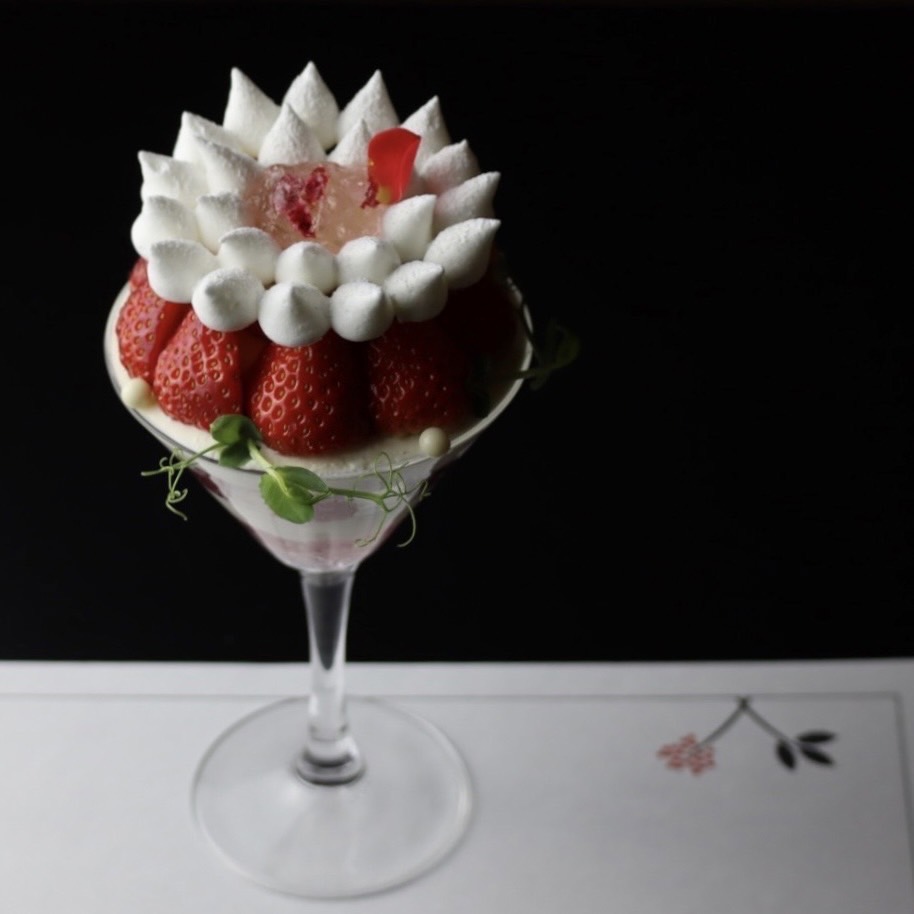 グラスの中は苺、シャンティクリーム、ジェノワーズでショートケーキのように楽しめ、アクセントに薔薇の香りが広がります。