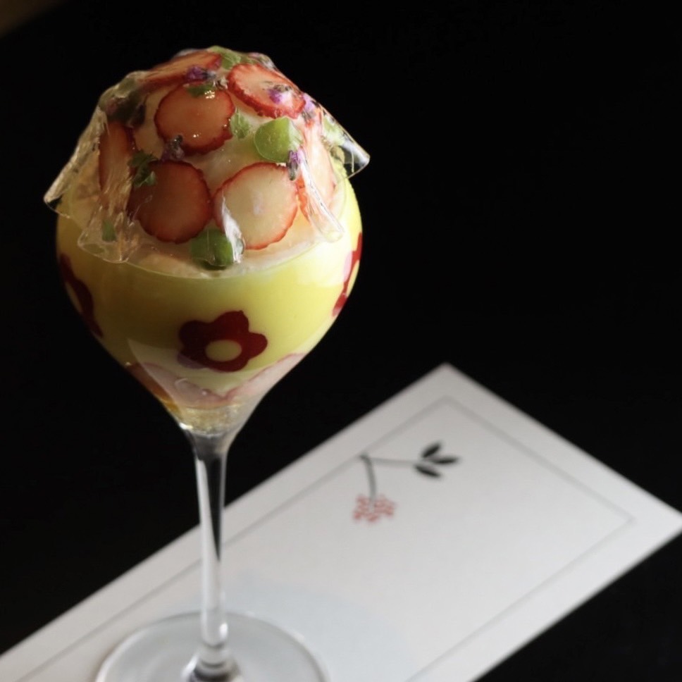 グラスの中には、檸檬と大吟醸のジュレのさっぱりとした味わいや、黒糖わらび餅やアーモンドフロランタンで食感にもアクセントを。