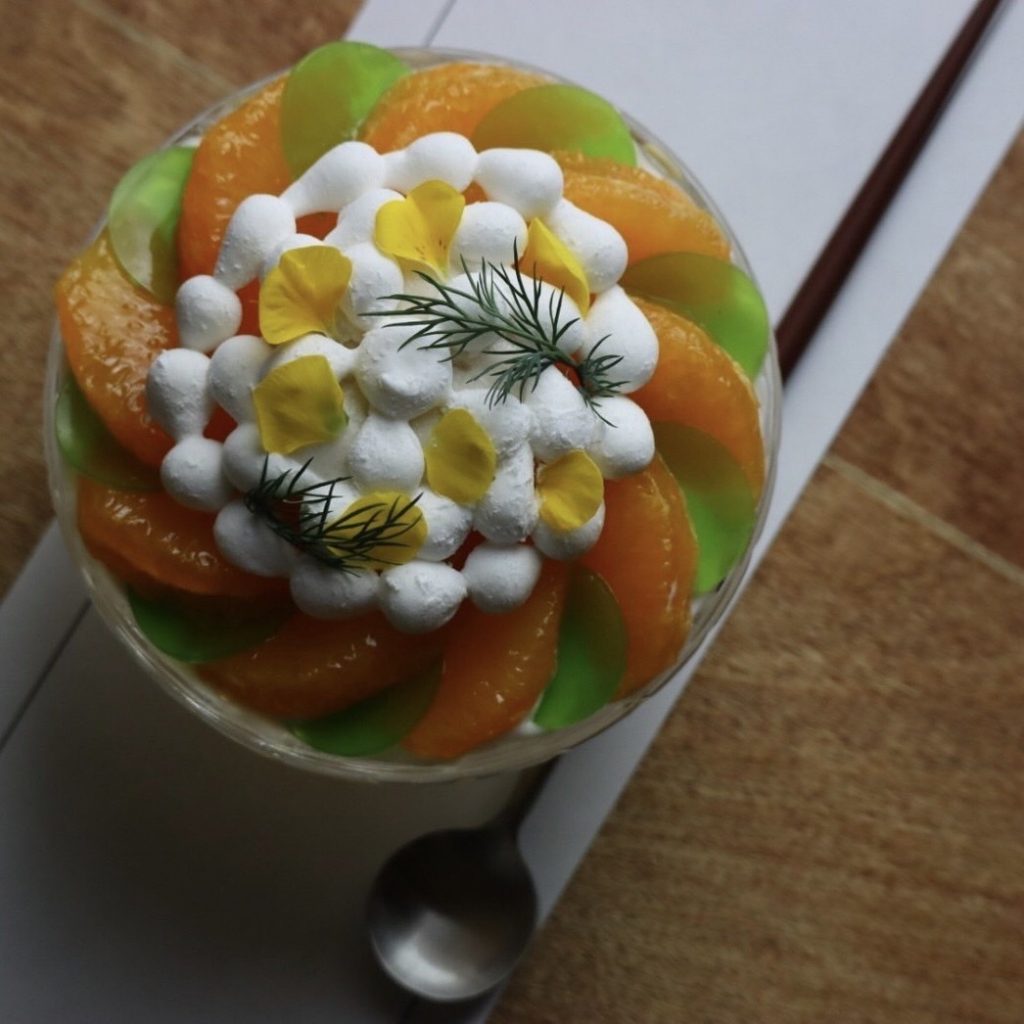 とろける食感と上品な甘さが特徴の、無農薬で育てられた「十勝マンゴー」で北国に咲く華やかなオレンジ色のマンゴー畑を表現しました。
