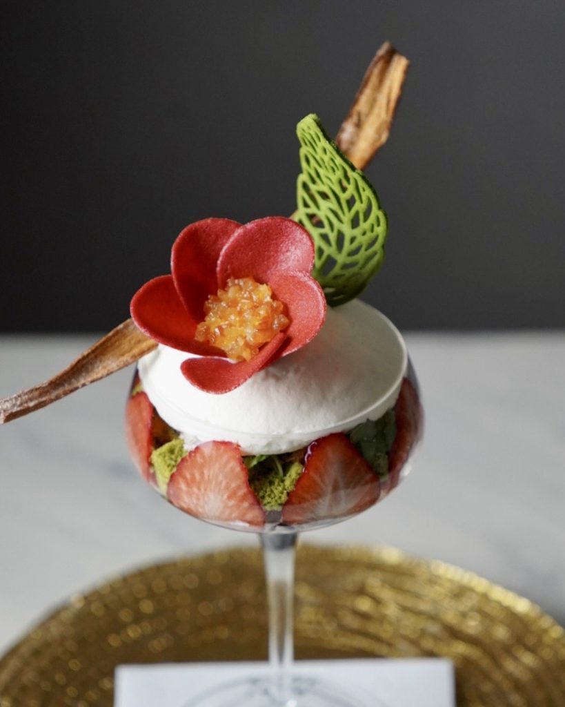 バラの華やかな香りで苺を飾り