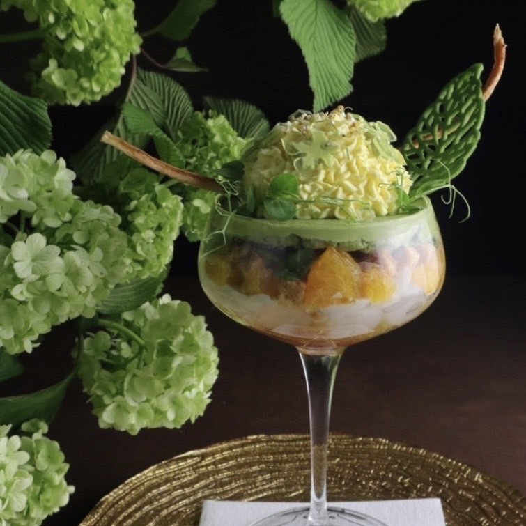 締まった果肉と濃厚な果汁のアメリカンチェリーと”ナッツの女王”と呼ばれるピスタチオをジェラートやプリンにして合わせました。