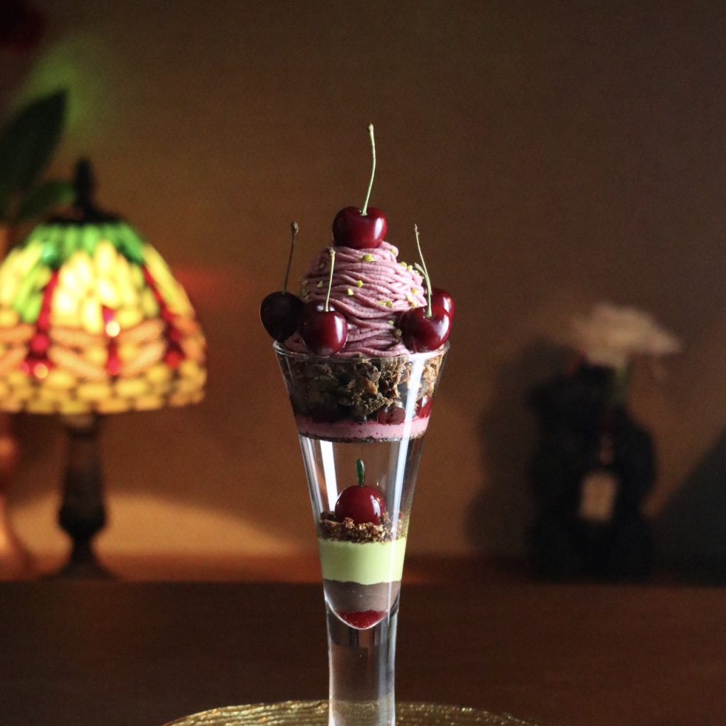 濃厚なチョコレートジェラートやクレームダンジュと甘酸っぱいさくらんぼの相性をお楽しみ下さい。