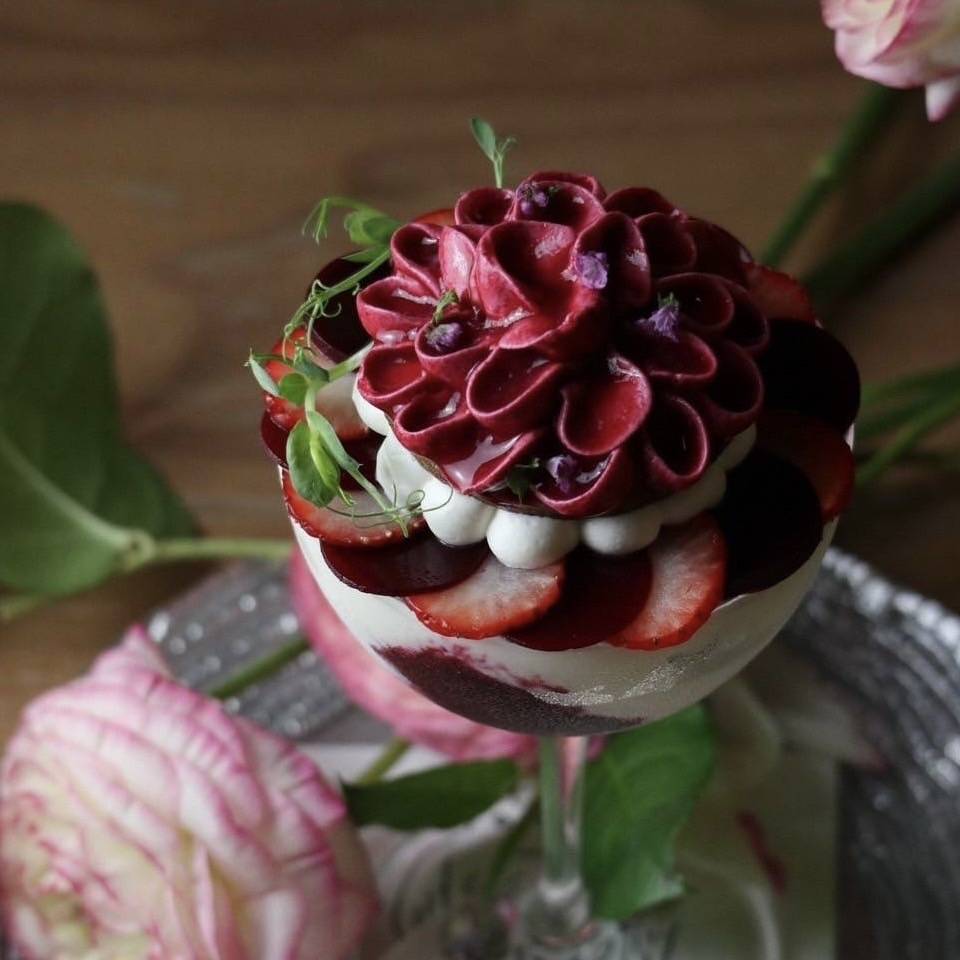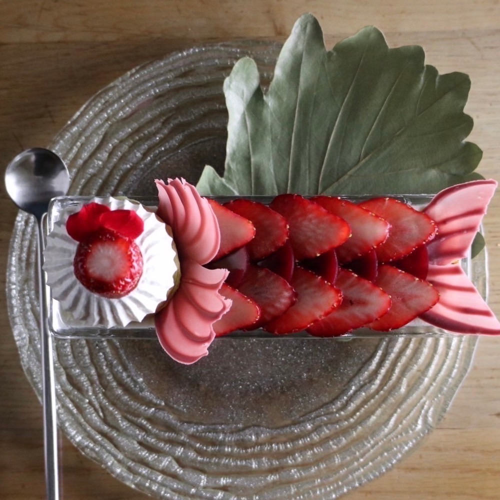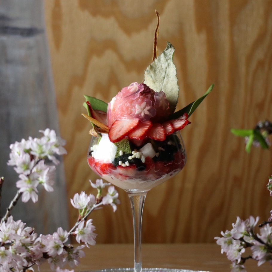 グラスの中には桜の風味を引き立てる抹茶のジェノワーズや、甘酸っぱいいちごのジェラートがございます。