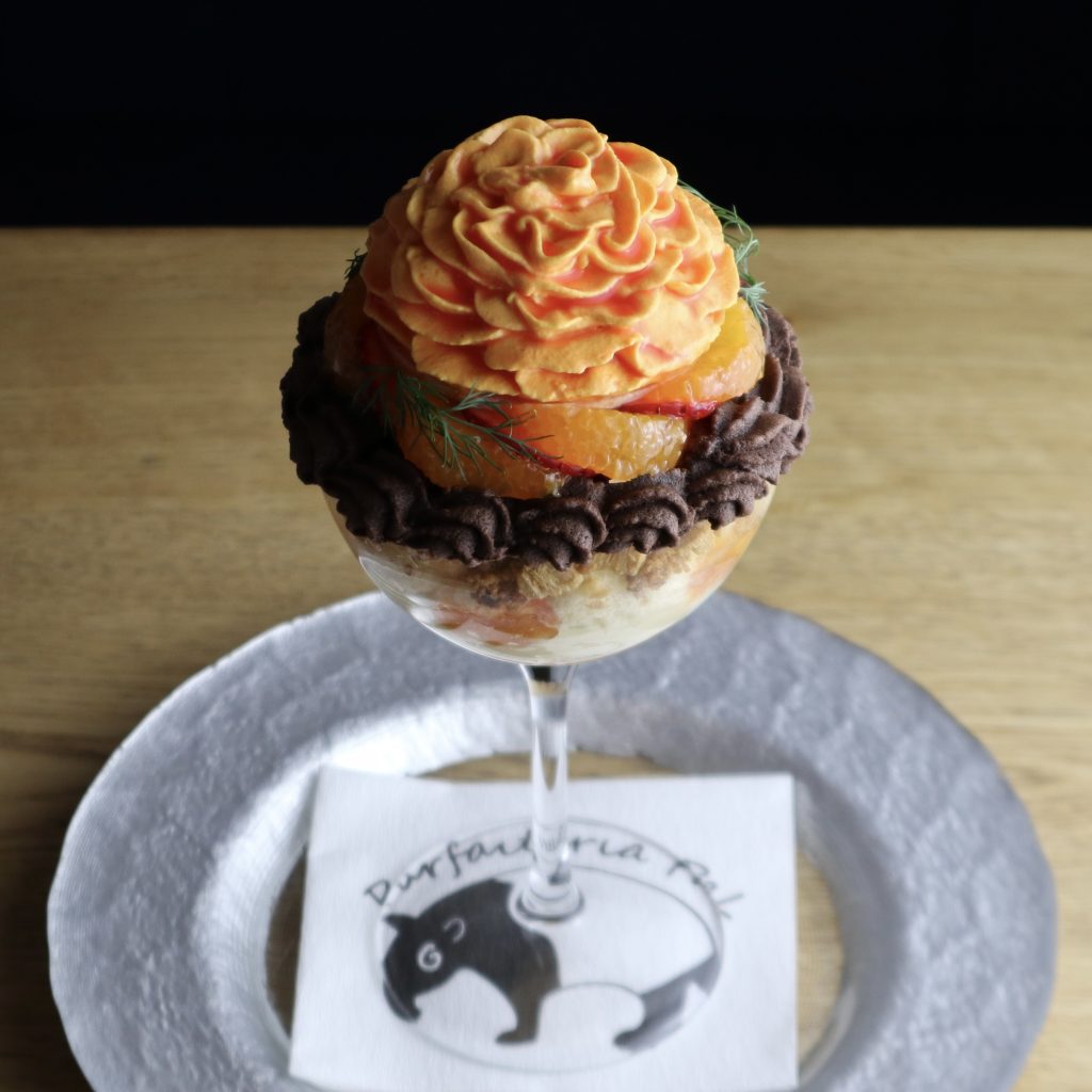 プラリネ、紅茶、りんごと3種類のジェラートが楽しめるパフェになっております。
