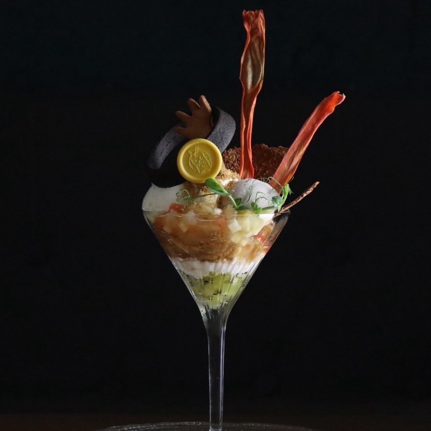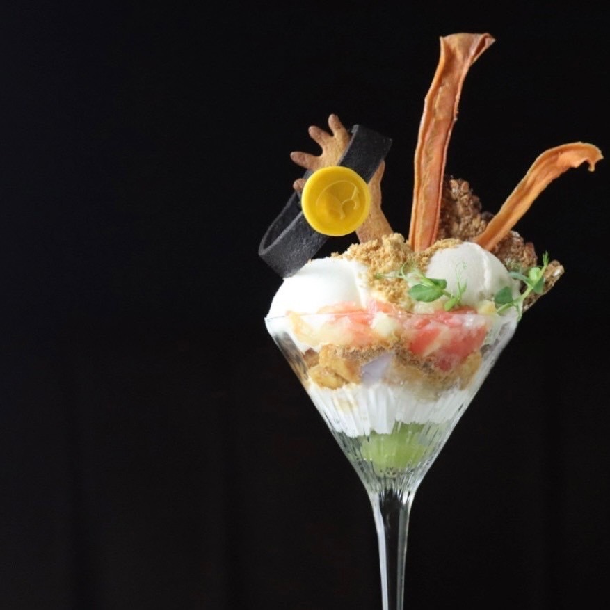 メレンゲにあずきジェラートやソフトクリームを付け、あんこの球体や苺、抹茶ティラミスと様々な味を味わえます。