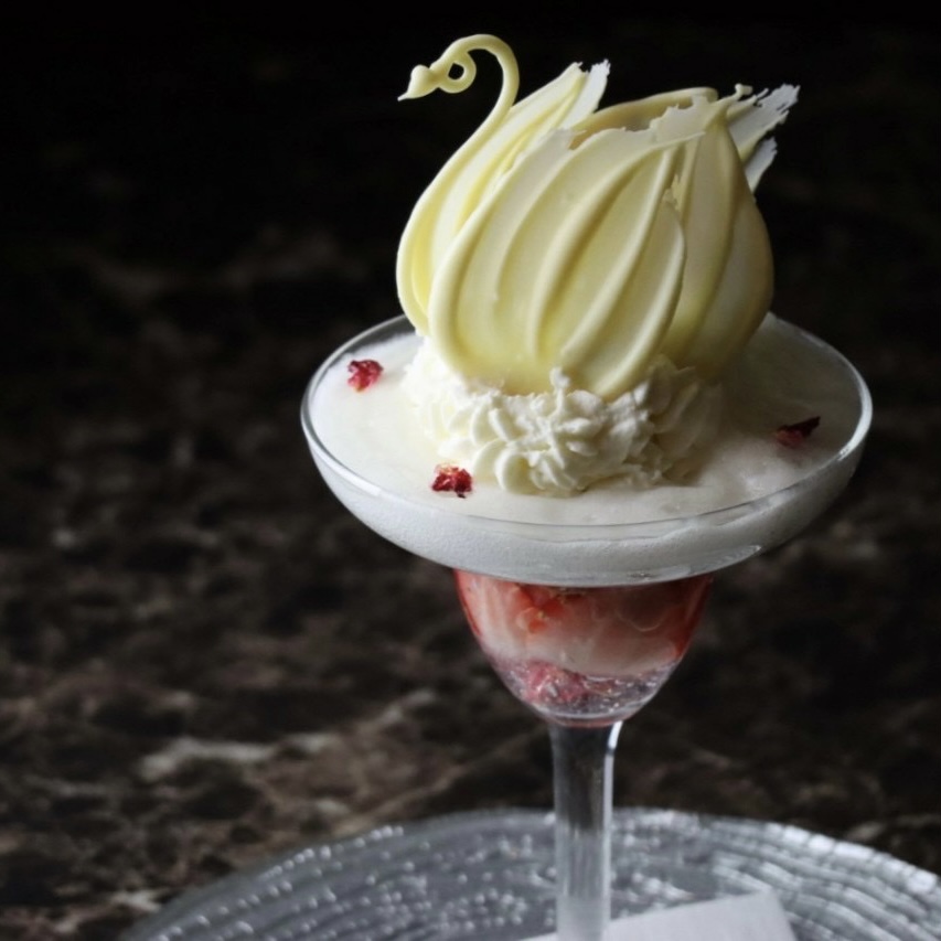 苺で表現した梅の花の下に男山大吟醸ジェラートがあり、グラスの中には梅ジュレや梅ソースの甘酸っぱさでほんのり甘い大吟醸ジェラートに仕上げております。
