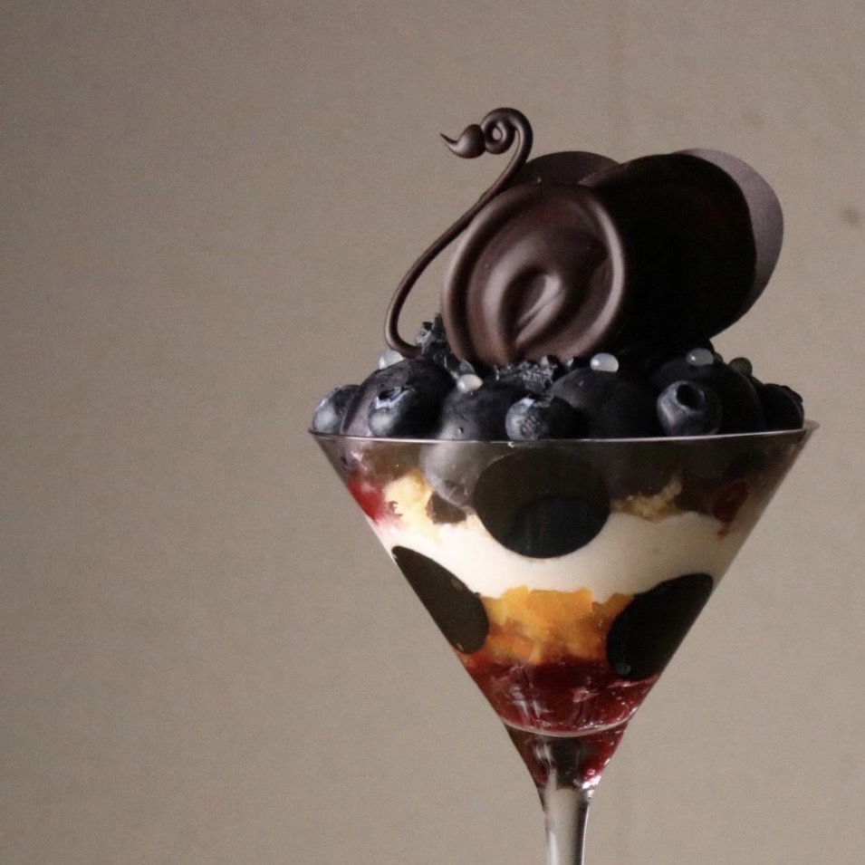 グラスの中のルバーブソルベやグリオットマセレの酸味あるパーツと相性が良いので、合わせてお召し上がり下さい。