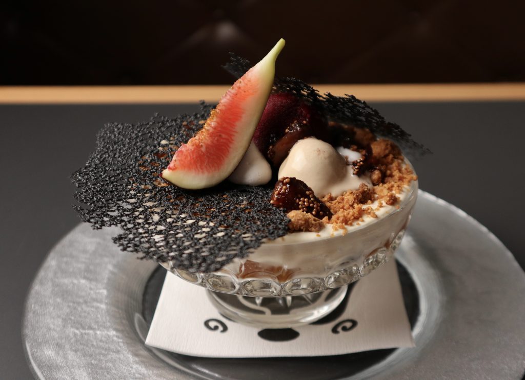 3種類のジェラートの濃厚な甘味と竹炭ダンテルの塩気、無花果の優しくも奥深い甘味を