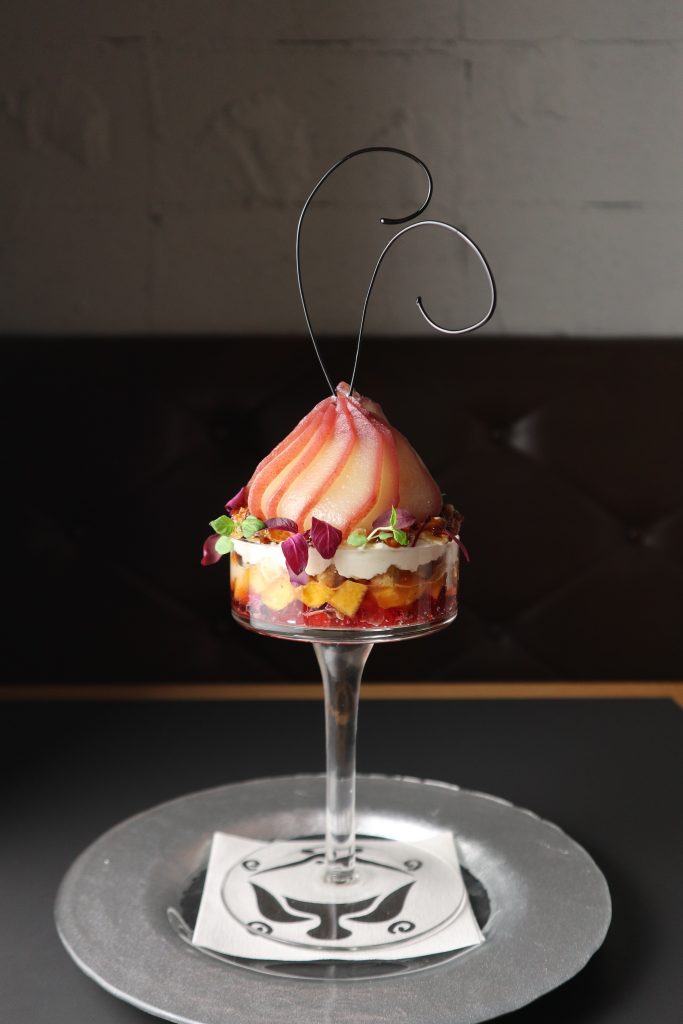 山椒と発酵乳のジェラートと洋梨が、彩り鮮やかに飾られた竹炭ダンテルの元で出会いました。