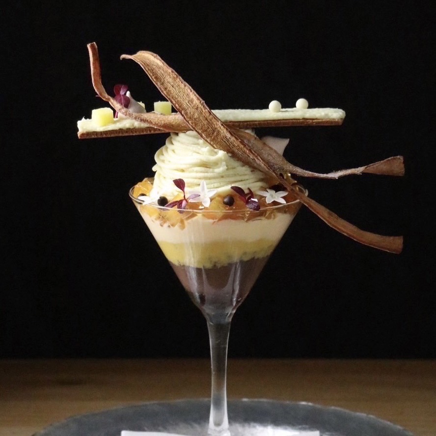 キャラメリゼしたバナナとチョコレートジェラートの甘くほろ苦い味わいとカルダモンケーキのスパイス特有のピリッとした味わいをアクセントにしております。