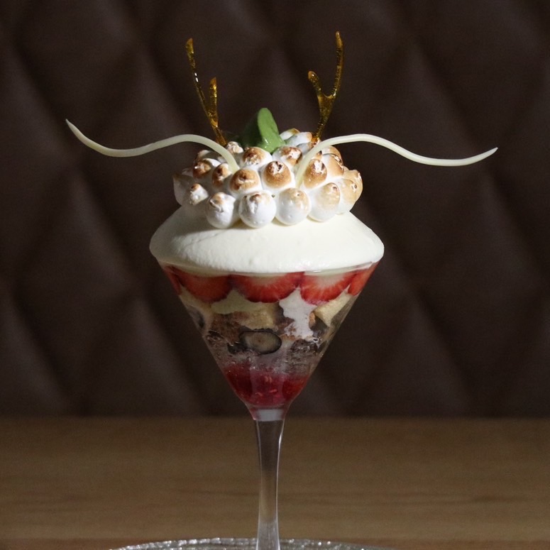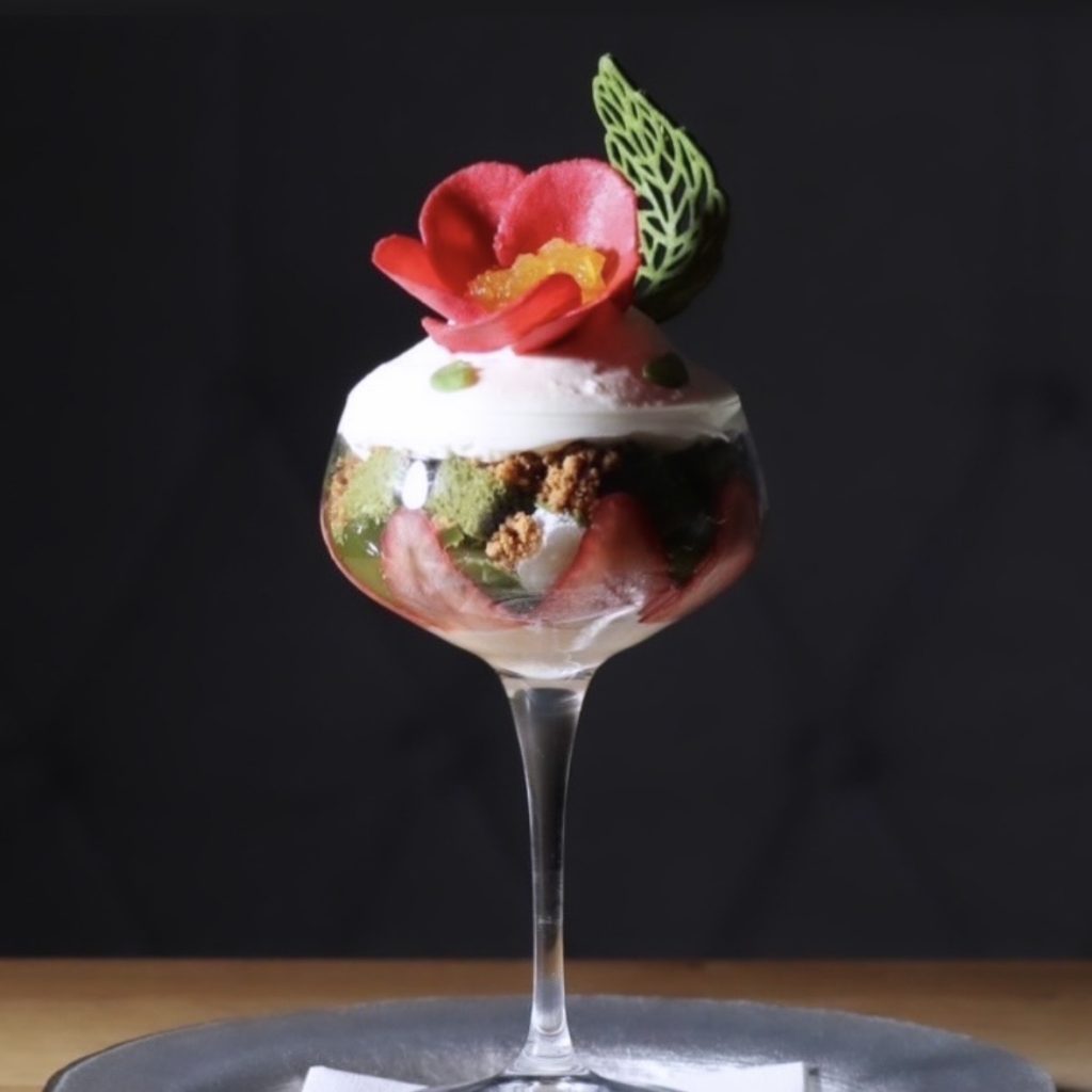 苺で表現した梅の花の下に男山大吟醸ジェラートがあり、グラスの中には梅ジュレや梅ソースの甘酸っぱさでほんのり甘い大吟醸ジェラートに仕上げております。