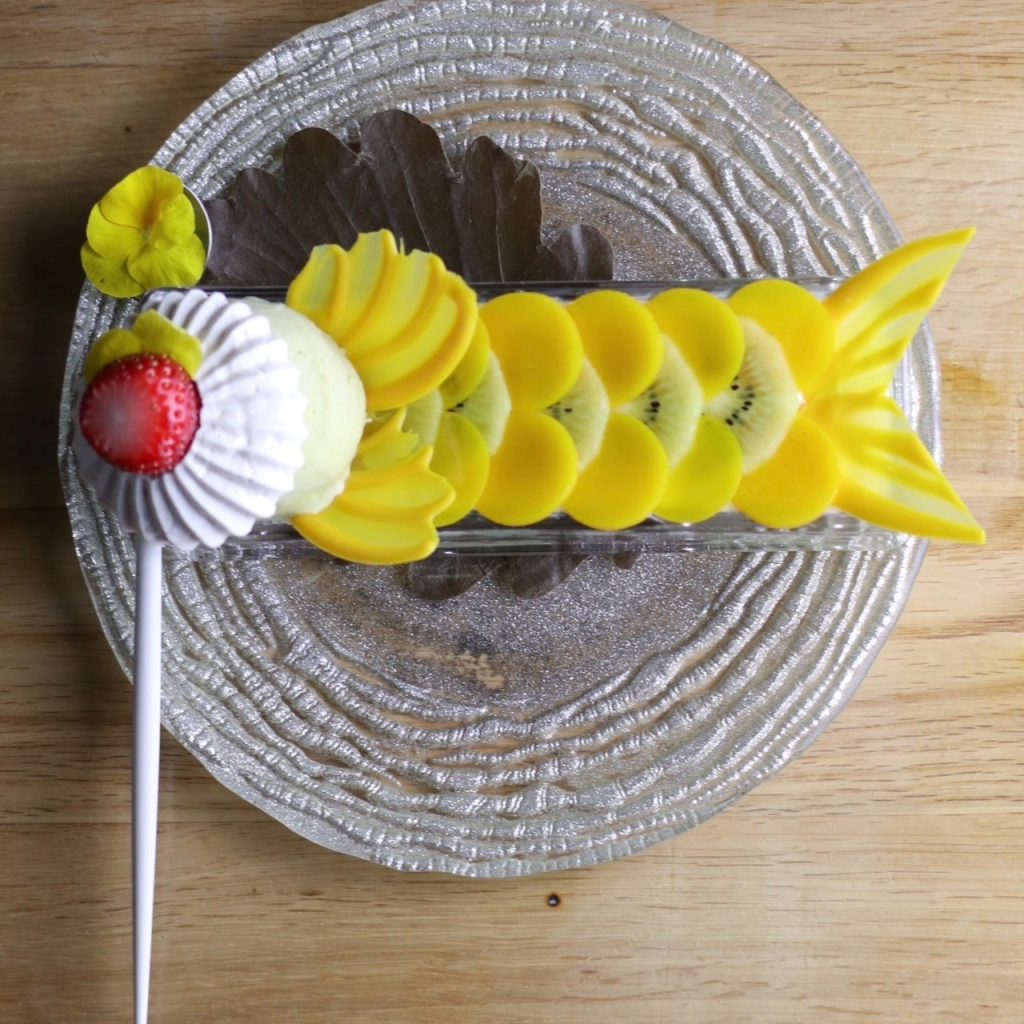 ラングドシャとコンフィチュールで作った椿を一輪落としました。